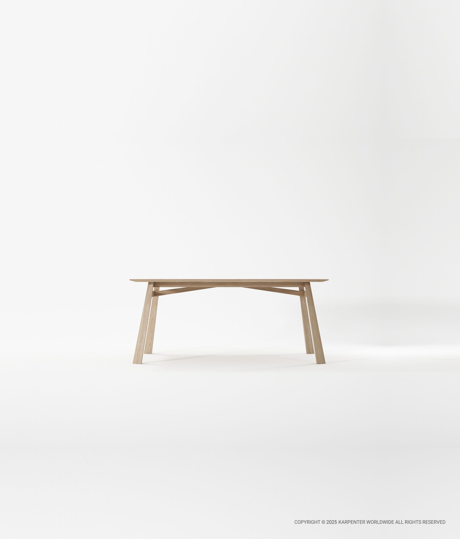 Meja elegan yang berfungsi sebagai pusat ruang makan di rumah.