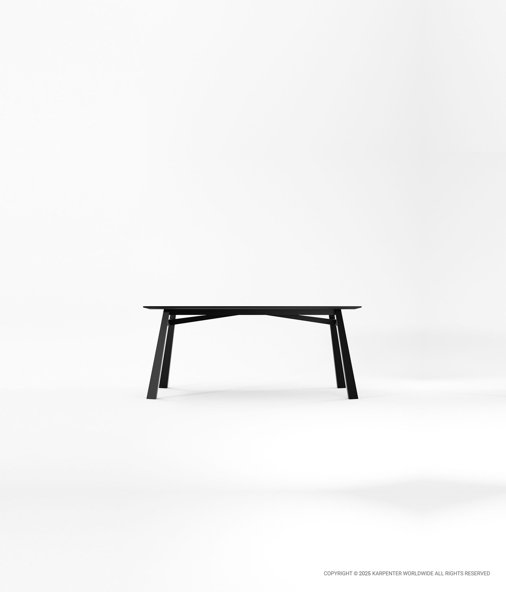 Meja elegan yang berfungsi sebagai pusat ruang makan di rumah.