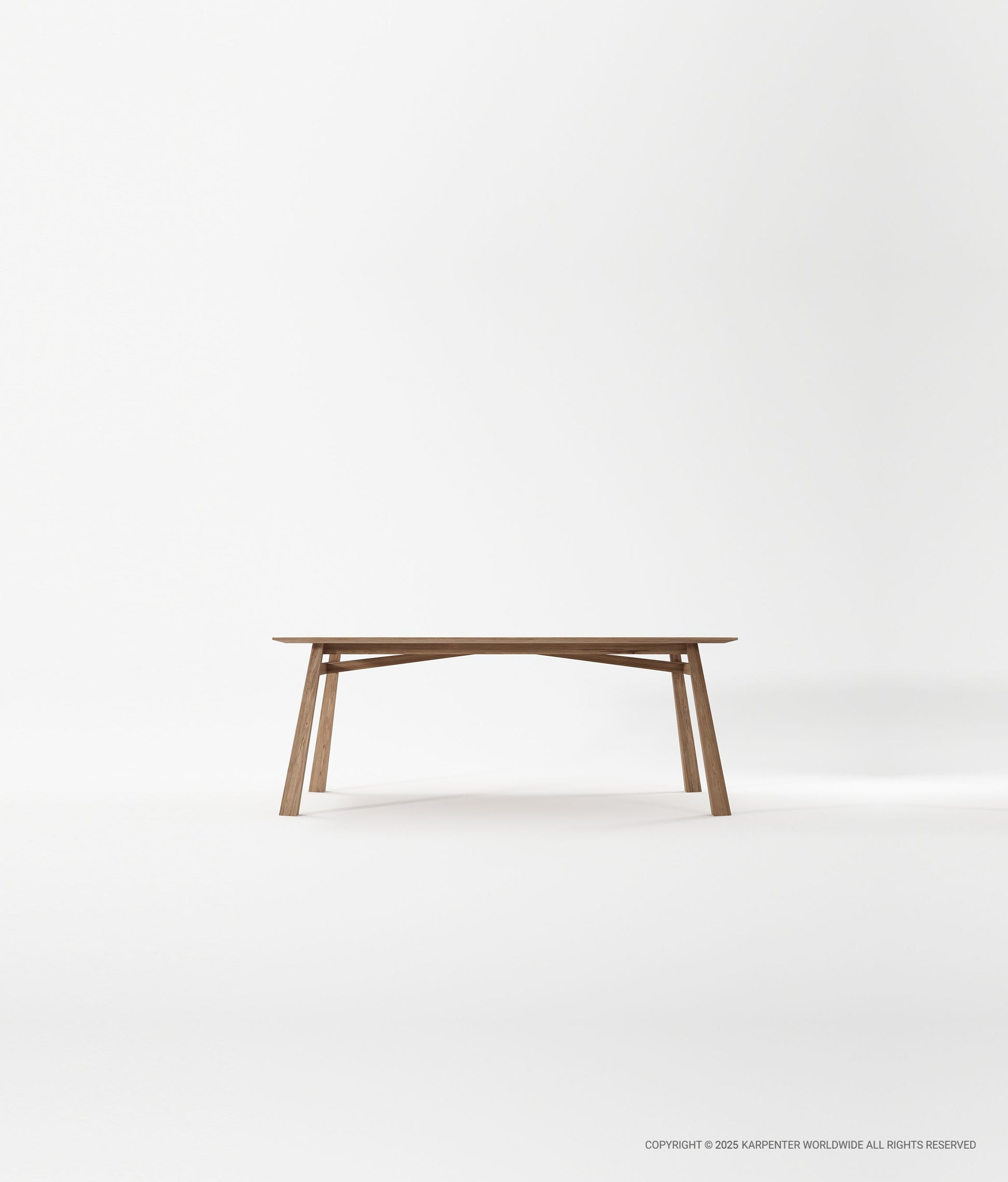 Meja elegan yang berfungsi sebagai pusat ruang makan di rumah.