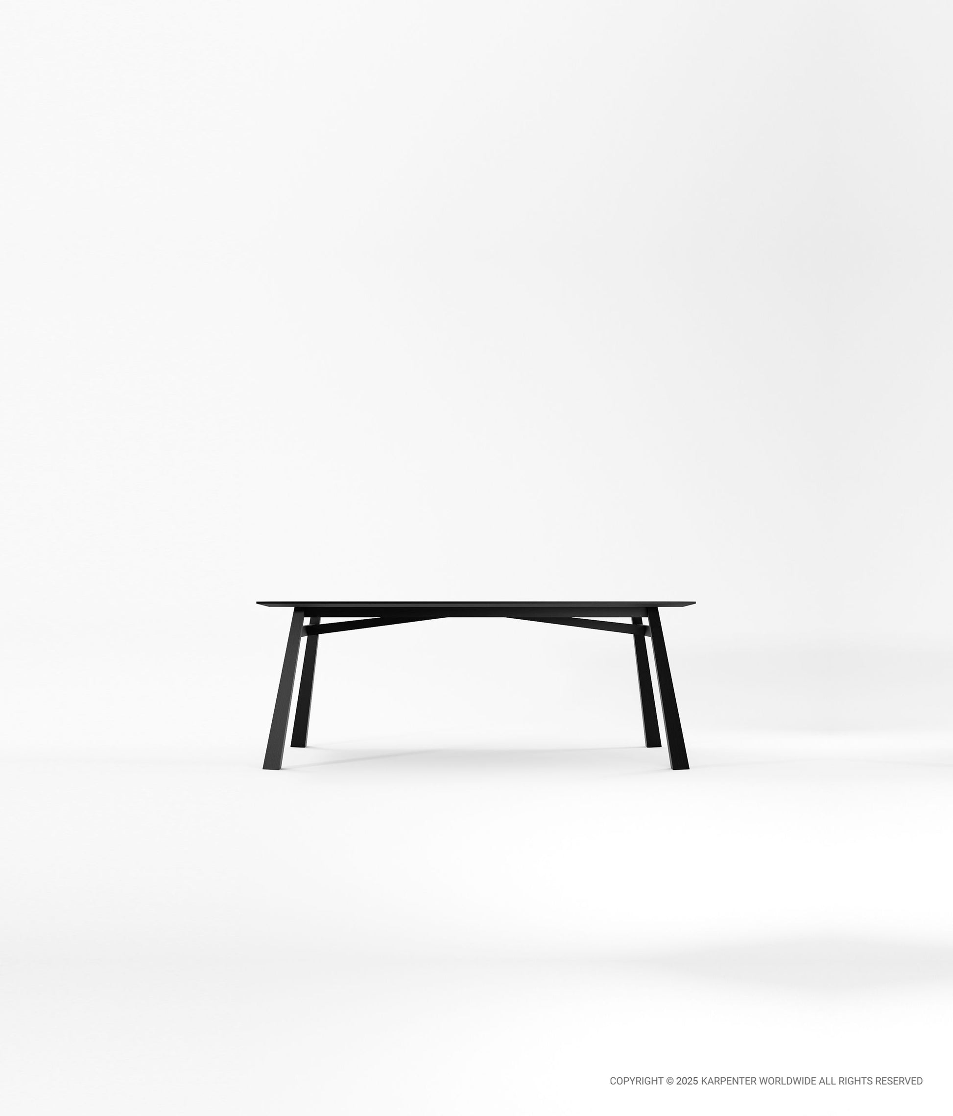 Meja elegan yang berfungsi sebagai pusat ruang makan di rumah.