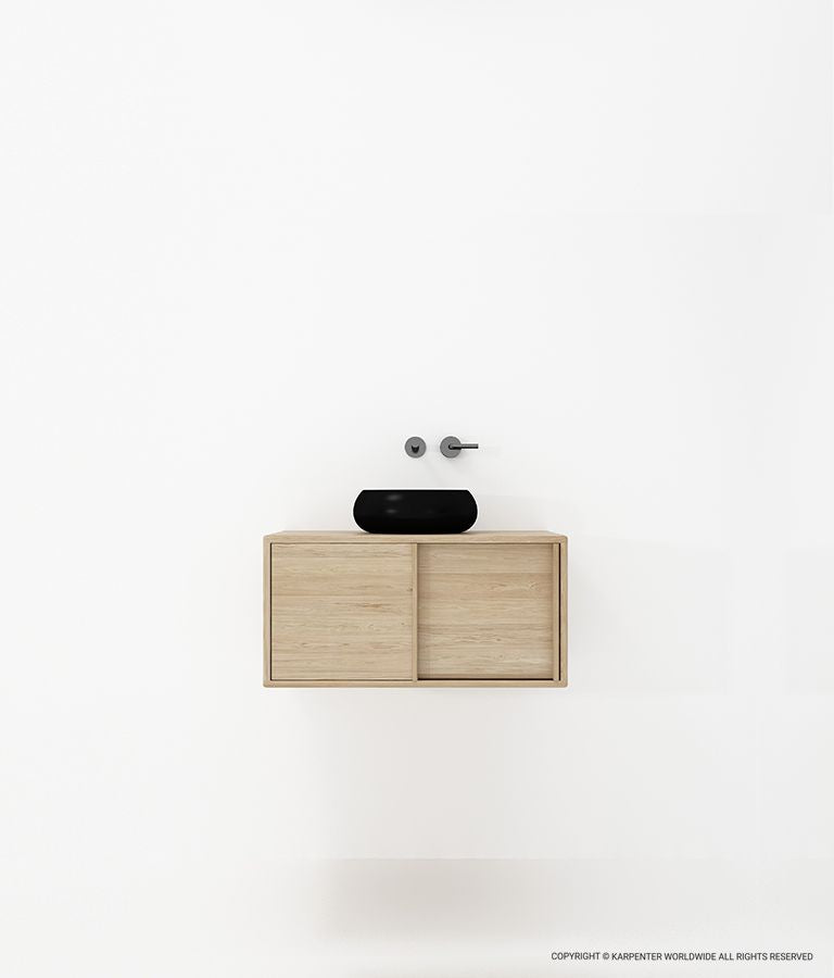 Kabinet wastafel gantung timur membangkitkan keteguhan, dengan pintu geser untuk menyimpan barang-barang penting Anda.