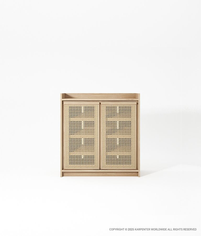 Rak sepatu yang memadukan gaya dan fungsi. Dua pintu anyaman rotan dan empat rak luasnya menawarkan tempat sempurna untuk sepatu‑sepatu Anda yang dirawat dengan teliti.