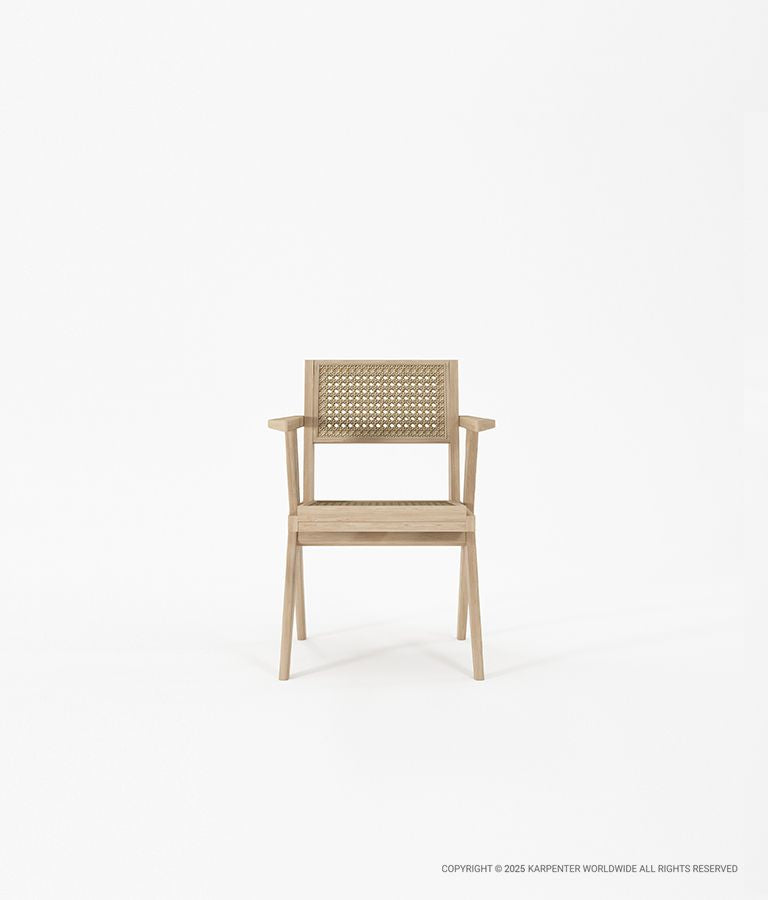 Kursi berlengan elegan berbahan kayu solid dan anyaman rotan, mengundang Anda untuk bersantai dalam ketenangan alam.