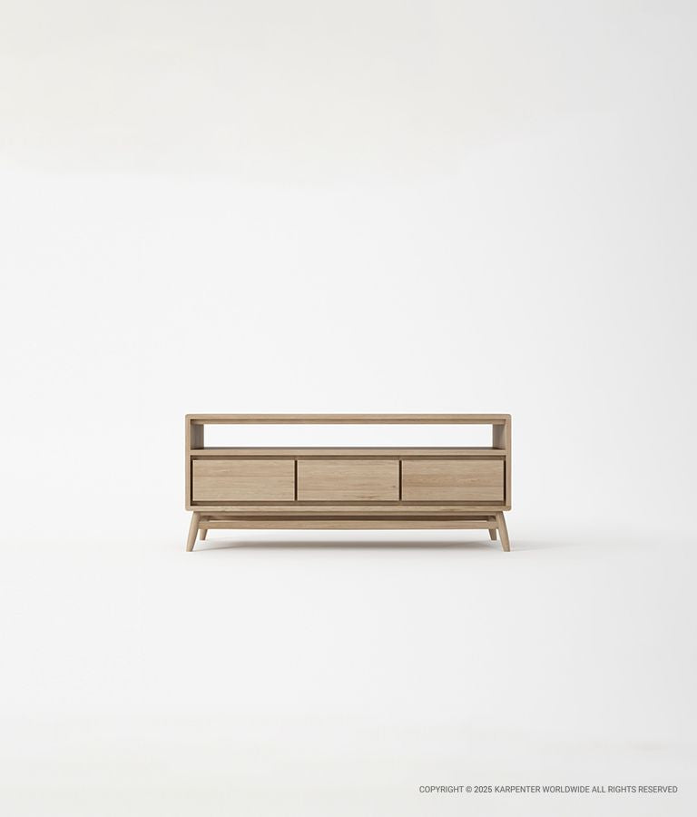 Lemari TV yang menakjubkan namun fungsional, karya ini menonjolkan keindahan alami kayu dalam desain yang ramping dan modern.