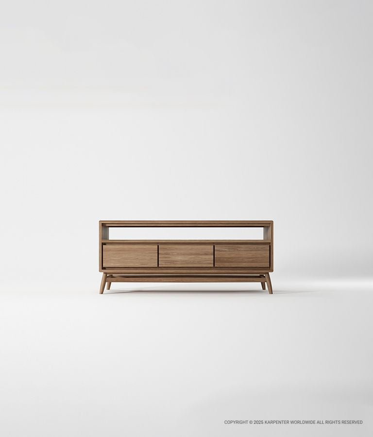 Lemari TV yang menakjubkan namun fungsional, karya ini menonjolkan keindahan alami kayu dalam desain yang ramping dan modern.